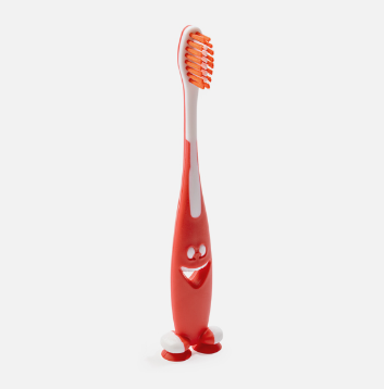 Cepillo de dientes para niños en vivos colores en acabado suave, con ventosas en la base para su sujeción.