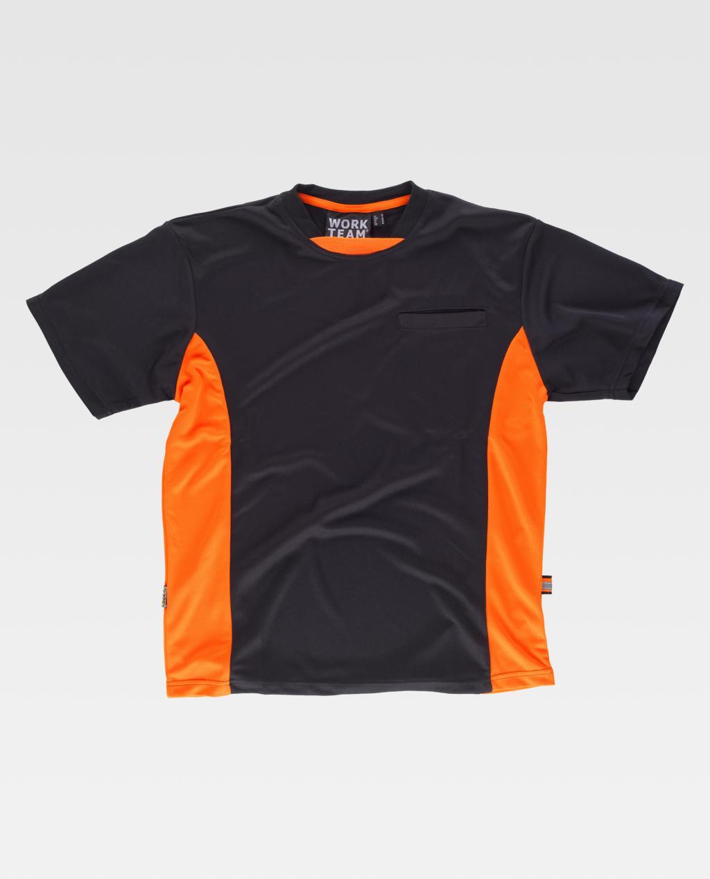 Camiseta combinada de manga corta en poliéster ojo de perdiz. Cuello redondo con pieza central a contraste y cubrecosturas interior. Un bolso de pecho de ojal. Detalles fluorescente-reflectantes. Tejido fresco y ligero de alta permeabilidad al aire. Transpirable, de fácil secado y resistente al encogimiento. Cuello en punto canalé.