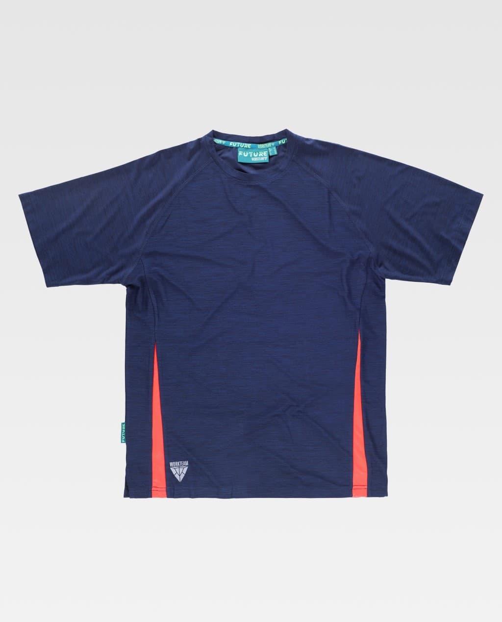 Camiseta combinada de manga corta en poliéster ojo de perdiz. Cuello redondo con pieza central a contraste y cubrecosturas interior. Un bolso de pecho de ojal. Detalles fluorescente-reflectantes. Tejido fresco y ligero de alta permeabilidad al aire. Transpirable, de fácil secado y resistente al encogimiento. Cuello en punto canalé.