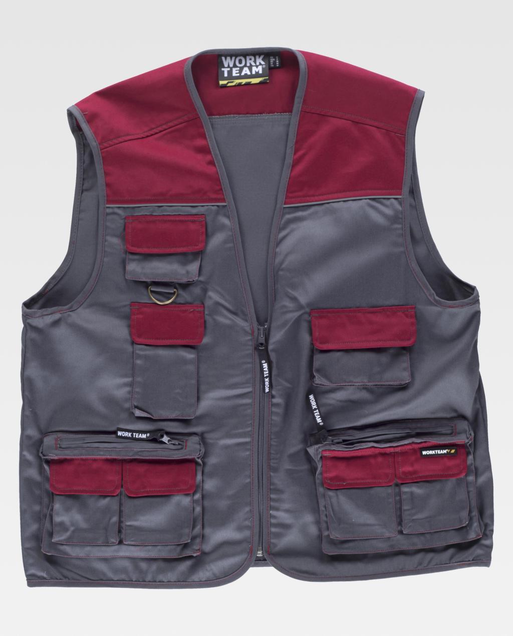Chaleco combinado tipo safari con vivos reflectantes. Escote a pico y canesús rematados con vivo. Cierre de cremallera de nylon. Tres bolsos de pecho de distinto tamaño con fuelle y cartera de velcro. Argolla metálica en el bolsillo superior. Dos bolsos laterales con fuelle y cierre de cremallera. Bolsillos auxiliares superpuestos con cartera de velcro. Bolso trasero con fuelle y cierre de cremallera. Ribeteado con bies.