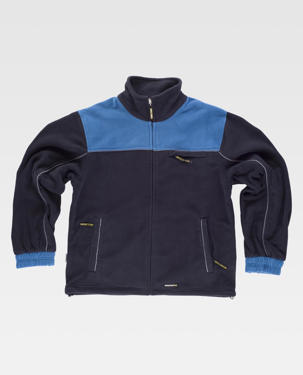 Chaqueta polar combinada con vivos reflectantes. Cuello alto y canesús con vivos a contraste que continuan en la manga. Cierre de cremallera de nylon. Un bolso de pecho y dos laterales interiores con cremallera de nylon. Puño con elástico. Cordón elástico con pieza ajustable en cintura.