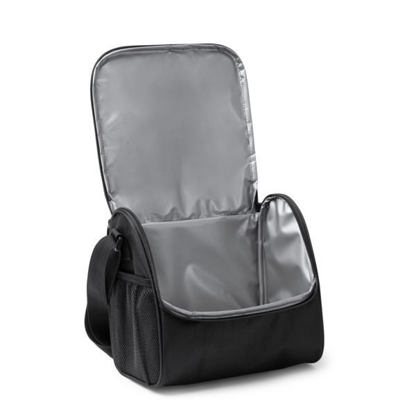 Nevera realizada en 600D RPET. Bolsillo principal con interior isotérmico. Práctico bolsillo frontal con cierre de cremallera y 2 bolsillos laterales. Cinta de transporte ajustable.