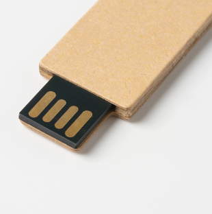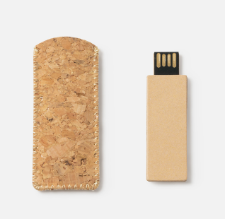 Memoria USB realizada con cartón reciclado, incluye una funda de corcho natural. Cuenta con una capacidad de 16 GB.