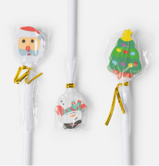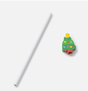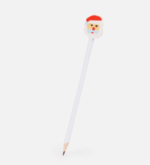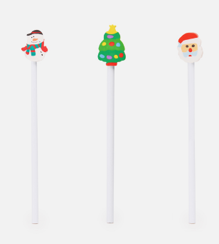 Lápiz de madera blanco y redondo con goma disponible en tres diseños navideños: árbol, Papá Noel y muñeco de nieve.