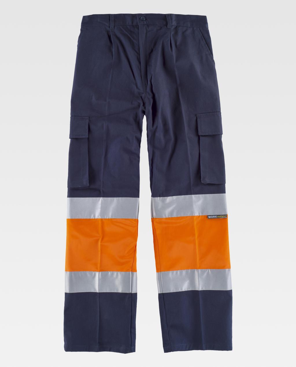 Pantalón de algodón combinado con alta visibilidad y cintas reflectantes. Dos bolsos de abertura inclinada en los costados, dos bolsos laterales de carga con cartera de velcro. Un bolso trasero interior con cierre de presilla y botón. Dos cintas reflectantes en perneras con pieza central de alta visibilidad. Elástico en la cintura. Trabillas. Cierre de botón y bragueta de cremallera.