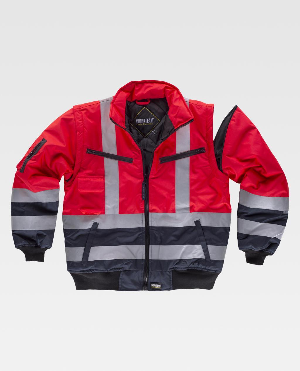 Piloto acolchada e impermeable en tejido Oxford, combinada, con mangas desmontables y cintas reflectantes. Parte superior de alta visibilidad. Cuello alto y cierre de cremallera de nylon. Dos bolsos interiores con cierre de cremallera y un bolso auxiliar de fuelle con cartera de velcro en el pecho. Dos bolsos laterales de ojal. Un bolso de plastón con cierre de cremallera y bolsillo compartimentado en la manga. Un bolso de pecho de plastón en el interior. Una cinta reflectante en hombros y dos en pecho, espalda y mangas. Puños y cintura elásticos en punto canalé.