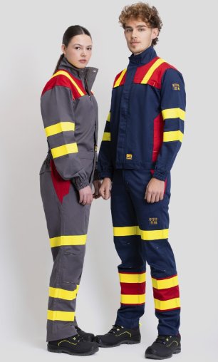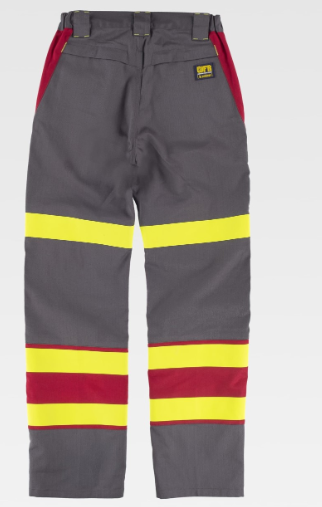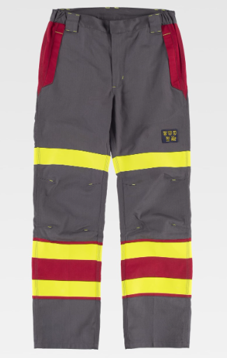 Pantalón combinado ignífugo, antiestático con protección para soldadura y arco eléctrico de visibilidad realzada con cintas fluorescentes amarillas y triple costura. Dos bolsos de abertura inclinada en los costados y dos bolsos traseros, todos de ojal con carteras de seguridad. Tres cintas termoselladas fluorescentes amarillas ignífugas en perneras. Elástico en la cintura. Trabillas. Cierre de corchete metálico y bragueta de cremallera de metal.